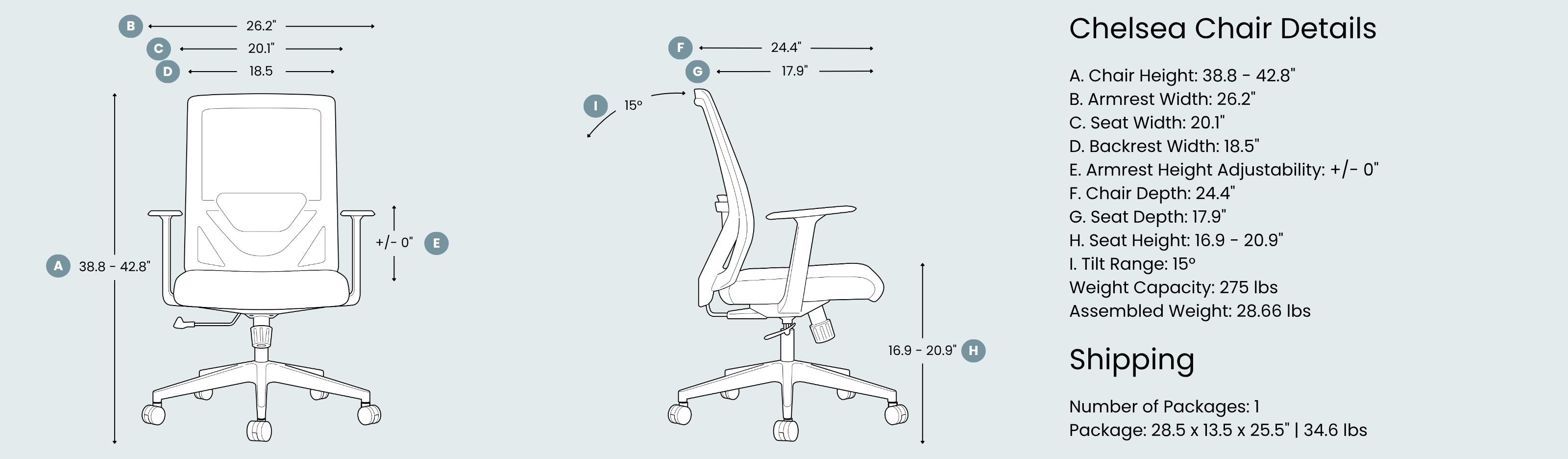 The Chelsea Chair is built for all-day support, whether you're working from home or in a focused office. A contoured, cushioned seat keeps you comfortable hour after hour, while the breathable mesh back and fixed lumbar support promote better posture. With adjustable seat height, tilt, and tilt tension, you can fine-tune the fit to match your routine.